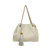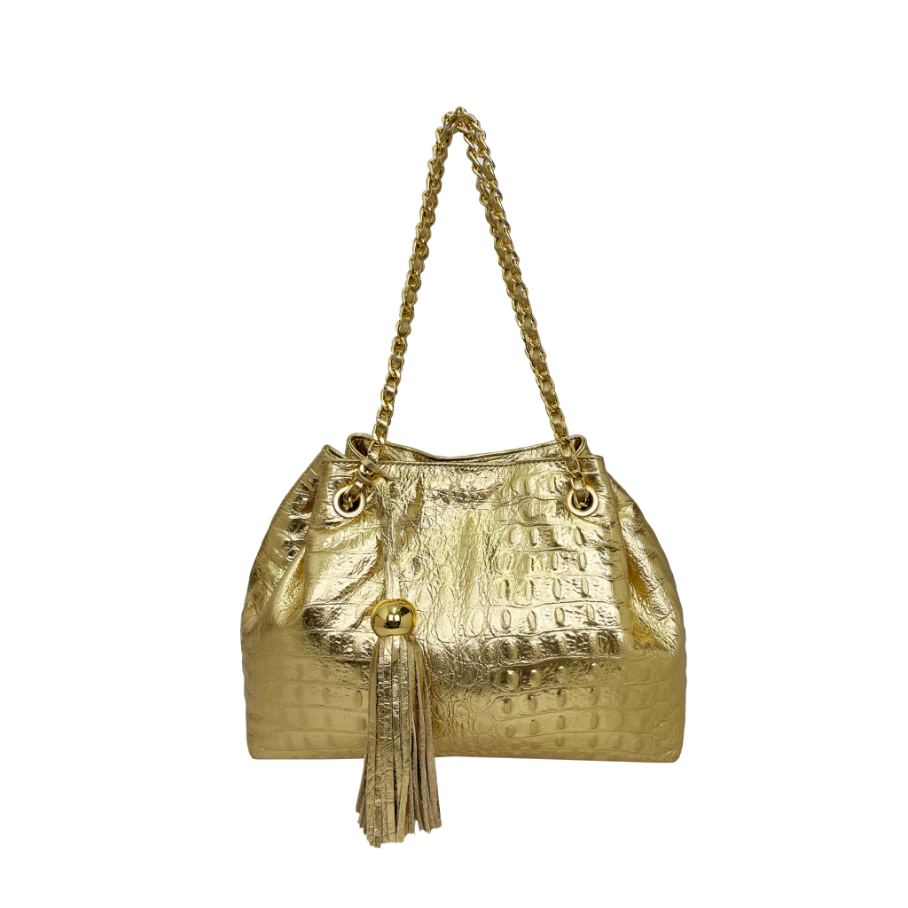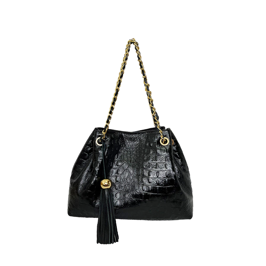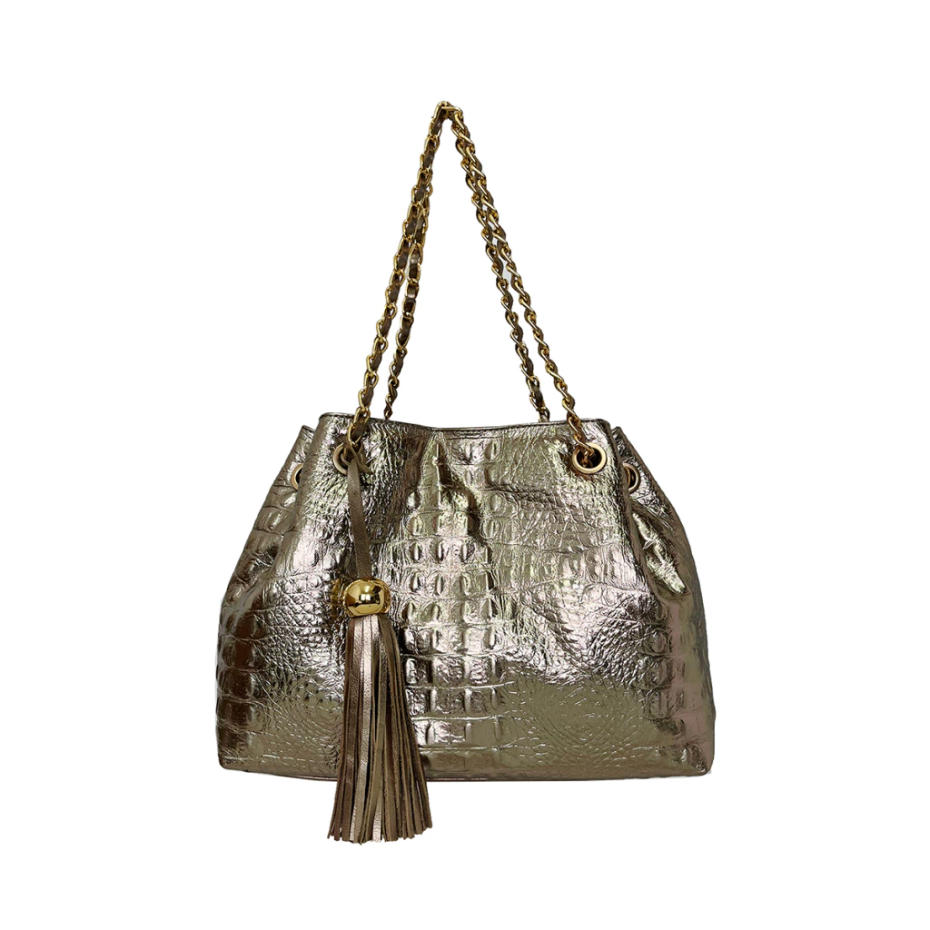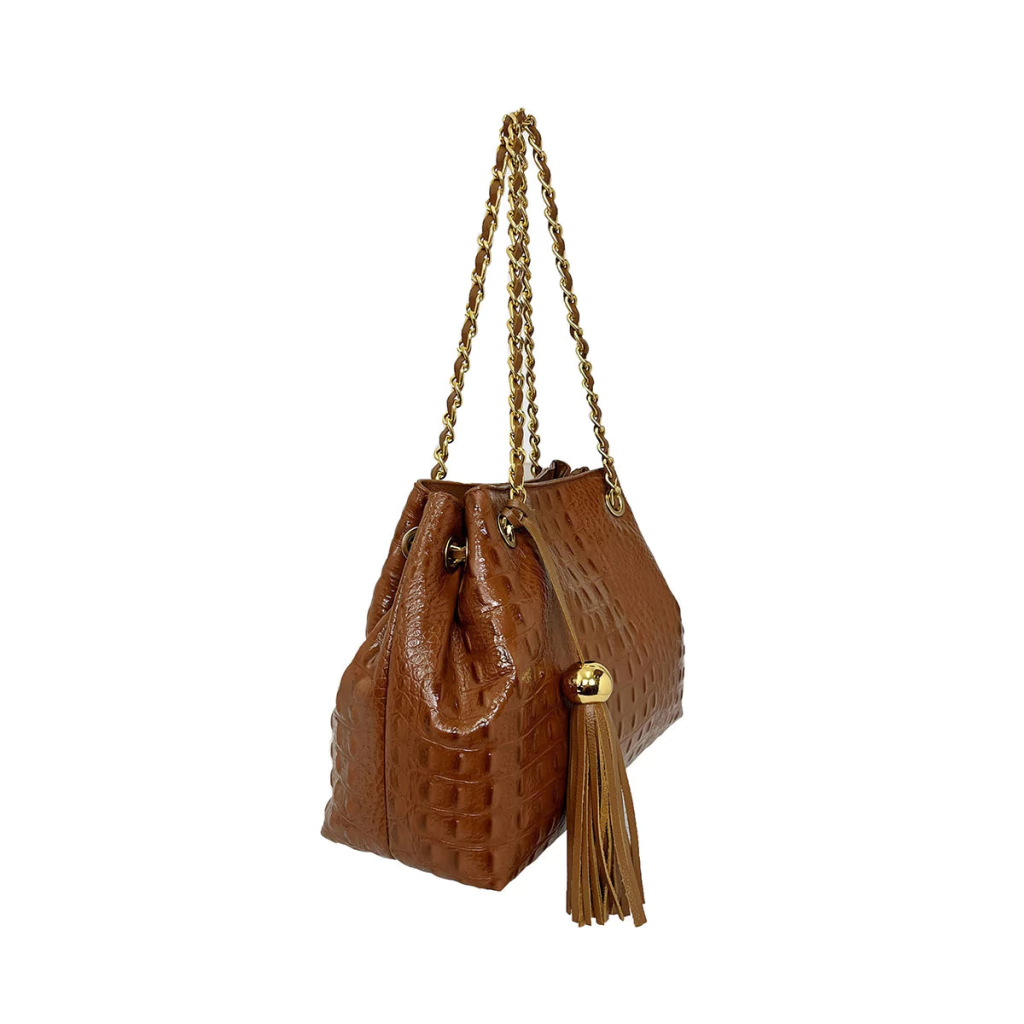 Nossa bolsa Jana, é feita em couro texturizado croco, possui um design de saco com alça de corrente entrelançada no couro.